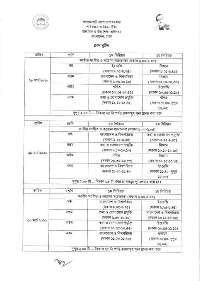আমার ঘর আমার ক্লাস অনুষ্ঠানের রুটিন